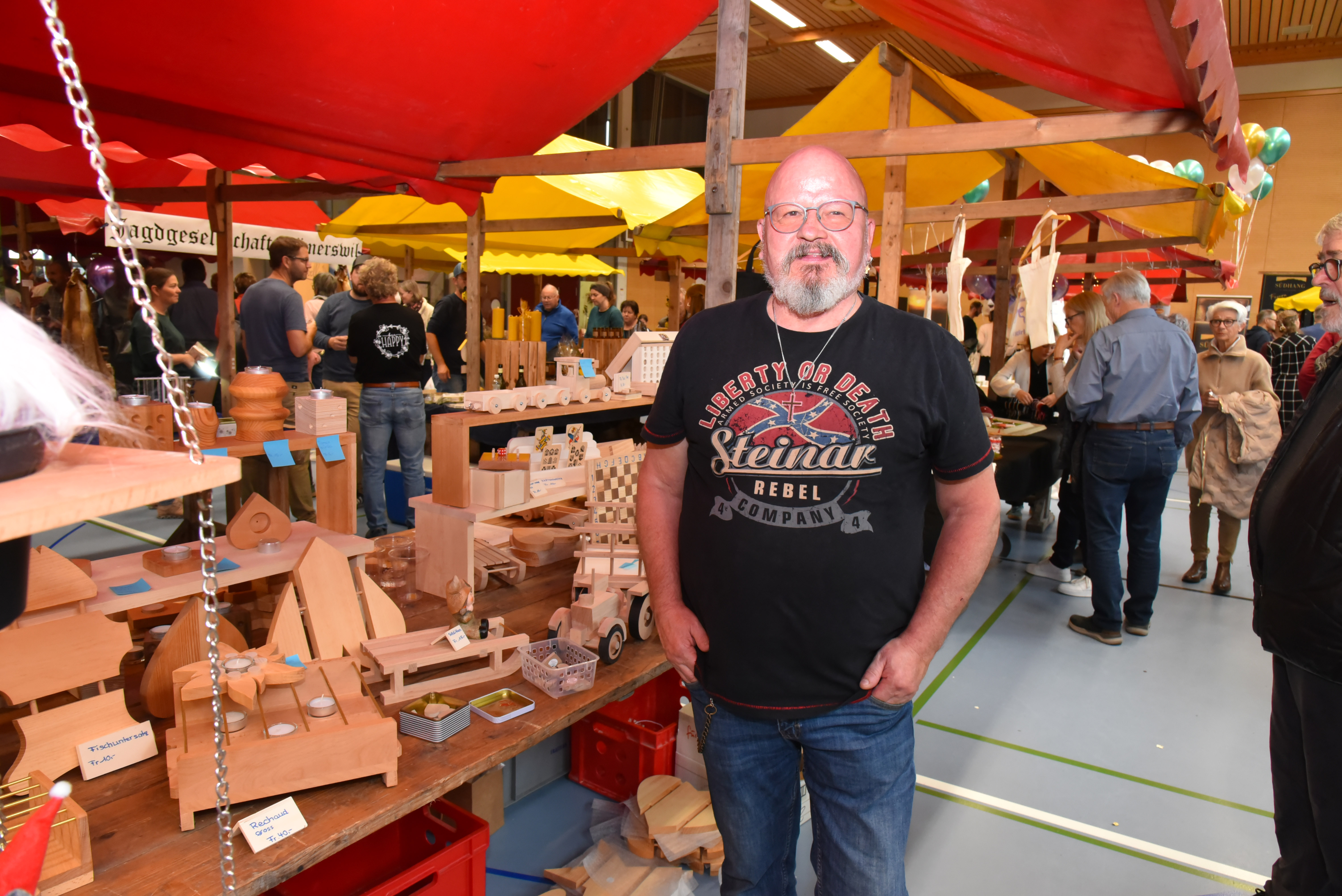 Hanspeter Odermatt aus Rain war zum ersten Mal als Aussteller dabei. Seine Holzspielzeuge fielen auf, denn sie sind sauber und handlich gearbeitet, aber sehr günstig. «Ich mache dies als Therapie für mich», erklärte er. Er habe sich von einem schweren Arbeitsunfall erholen müssen. Die Arbeit bereite ihm einfach Freude und es sei schön, wenn er damit auch anderen eine Freude machen könne. «Sind die Produkte zu teuer, kauft sie niemand und ich habe keinen Platz mehr, um weitere Produkte herzustellen», sagt er.