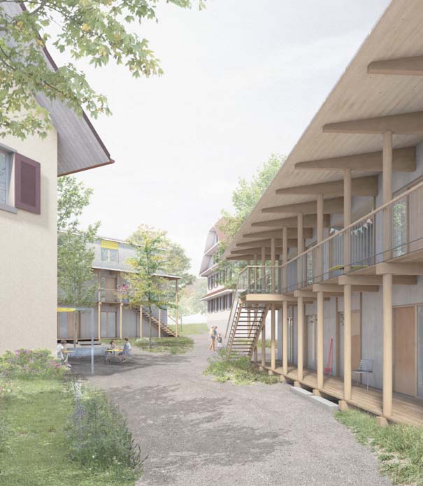 Das Siegerprojekt besticht insbesondere durch die Ausgestaltung des öffentlichen Raums, indem der heutige Kirchenplatz teilweise begrünt wird und zwischen Pfarrhaus und Käserei ein neuer Innenhof für die Quartierbevölkerung entsteht.