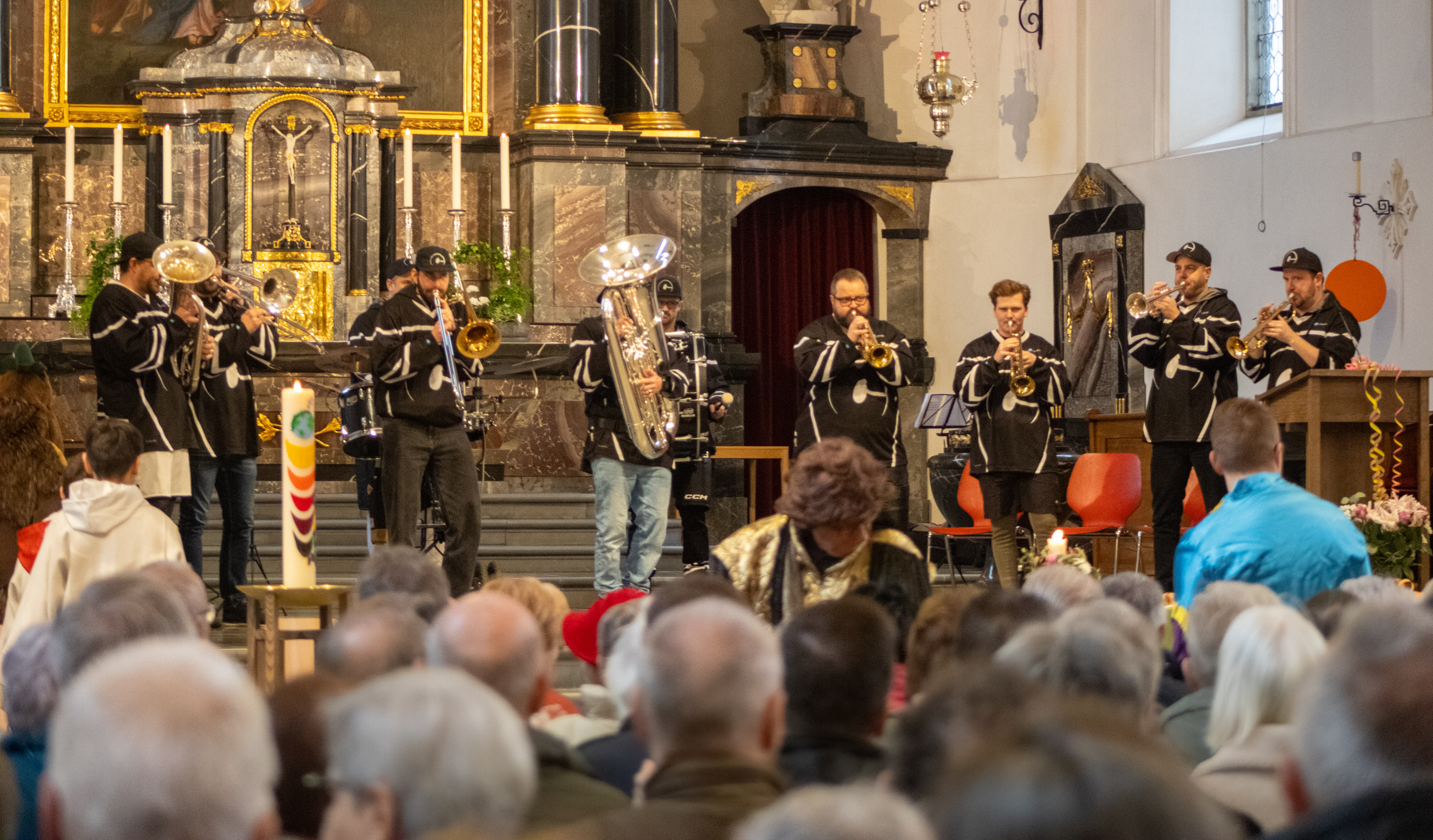 Auch wenn urbi@orbi in Sempach längst zu den alten Hasen gehört, ganz ohne Premiere ging es dann doch nicht über die Bühne – oder besser gesagt: über den Altarraum. Die Kleinformation Obacht spielte nämlich zum allerersten Mal in einer Kirche. Dass der Auftritt am Sonntagmorgen zu den frühesten Einsatzzeiten in der Bandgeschichte zählen dürfte, überspielten die zehn Musikanten mit bewundernswerter Routine. Von Müdigkeit keine Spur, stattdessen sorgten sie mit ihren musikalischen Klängen für die perfekte fasnächtliche Umrahmung des Gottesdienstes. Mal leise, mal laut, mal in der Hocke, mal kerzengerade stehend – Abwechslung war garantiert. Und das Publikum? Das liess sich nur allzu gern mitreissen und bewies einmal mehr: Fasnacht funktioniert auch ohne Ausschlafen.
